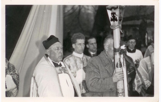 Ksiądz proboszcz Józef Opioła i ks. katecheta Marek Krupa witają Matkę Najświętszą – 1970 r. – Szebnie Obóz pracy przymusowej