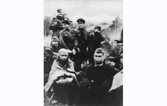 Grupa jeńców sowieckich grzejących się przy zapalonym ognisku. Niemiecki wartownik uzbrojony w karabin w płaszczu i furażerce.