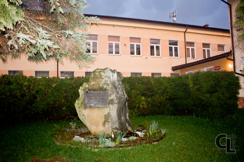 Pamiątkowy kamień ustawiony na placu przed szkołą w Szebniach